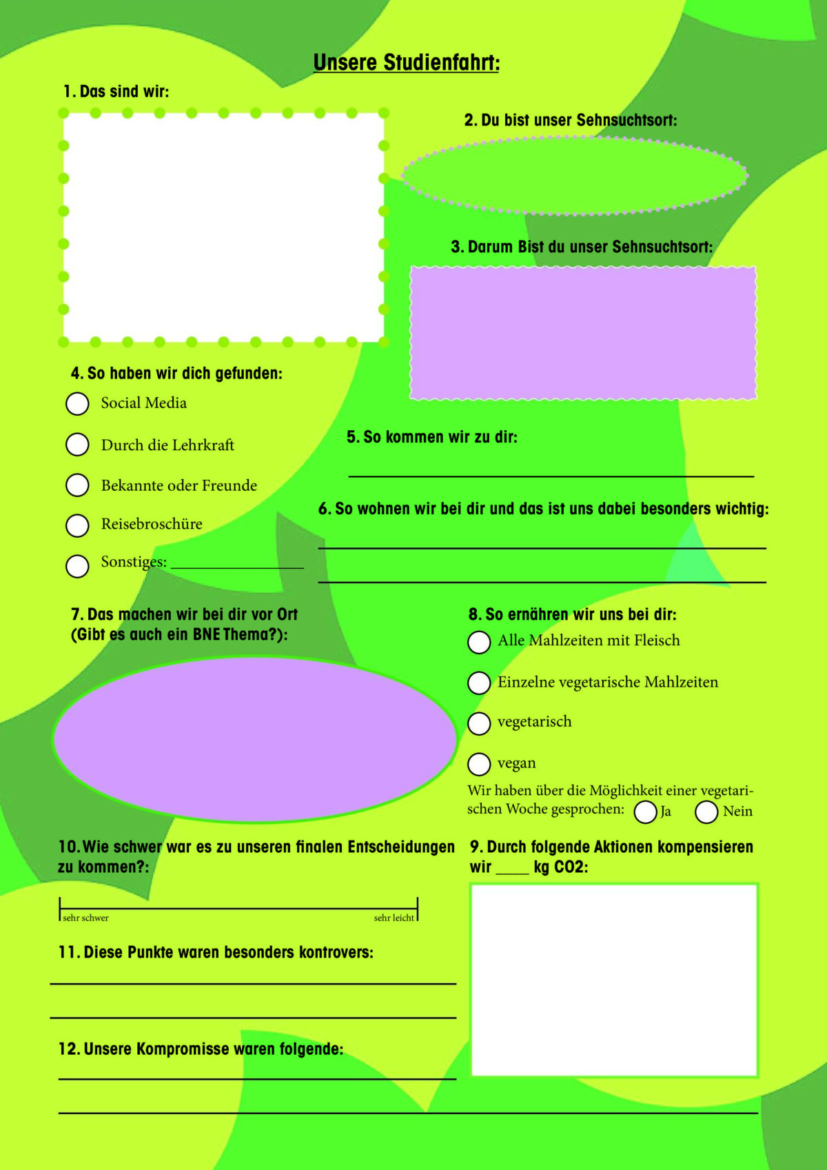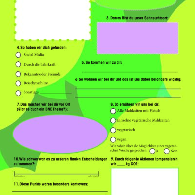 Bildung für nachhaltige Entwicklung ist eine der drei Leitperspektiven schulischen Unterrichts in Hamburg. Jedoch wird dieser Gedanke nicht nur unterrichtlich gesehen, sondern als Whole-School-Approach und umfasst damit das gesamte schulische Handeln und somit auch die Studienreisen an einer Schule. Da BNE besonders die Handlungskompetenz der Schülerinnen und Schüler (SuS) stärken und fordern soll, erscheint es uns logisch, dass vor allem die SuS in einem Aushandlungsprozess zentral in die Planung und Umsetzung der Fahrt involviert sind. Durch die Information über einzelne Aspekte nachhaltiger Fahrten, dem Bewerten und Abwegen dieser Informationen und der letztendlich bewussten Entscheidung (Handeln) für ein Ziel, sollen die SuS einen möglichst demokratischen Prozess hin zu einer nachhaltigen Klassenfahrt durchlaufen. Als Orientierungsrahmen gelten folgende zehn Punkte:
