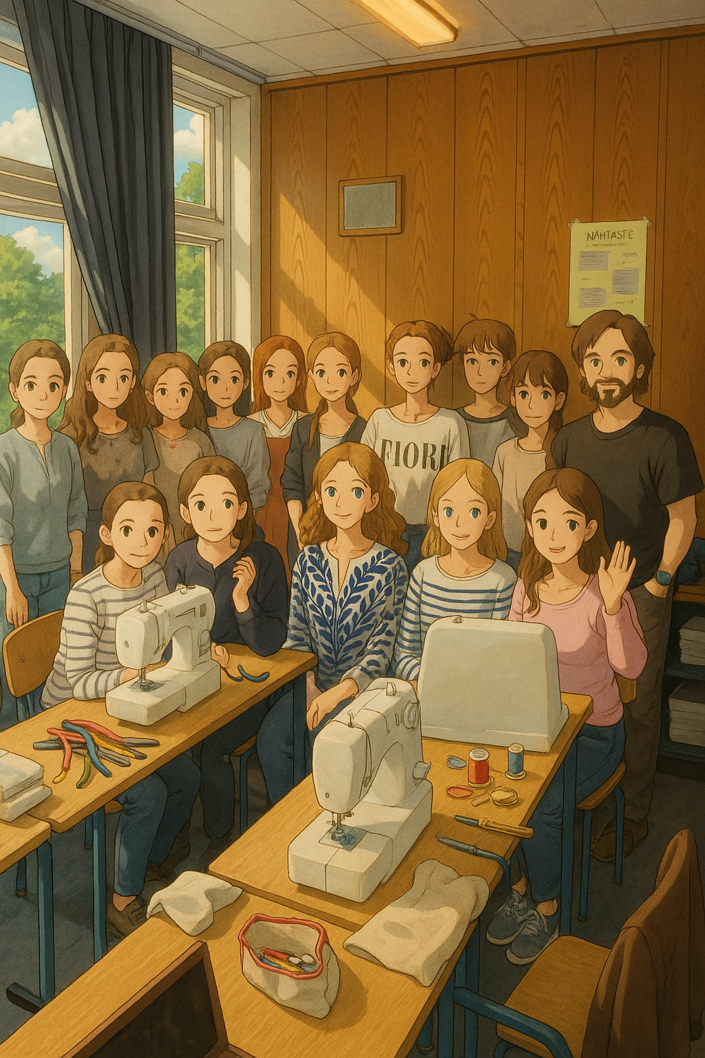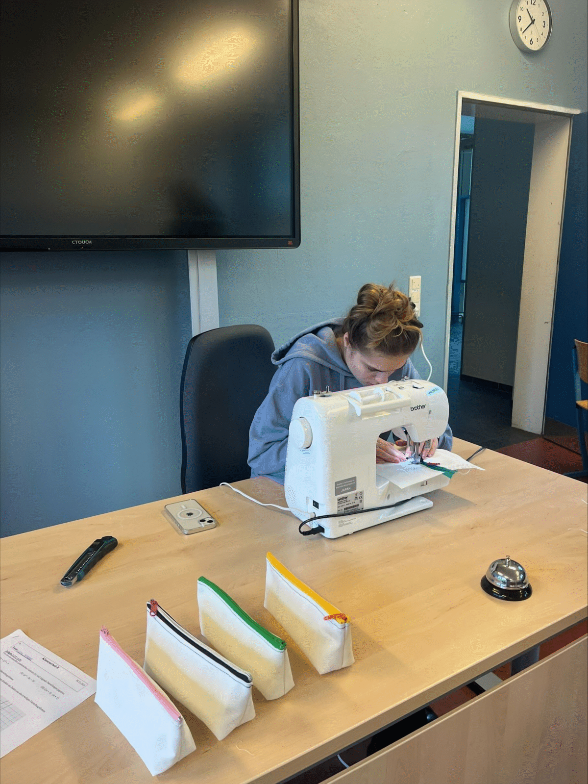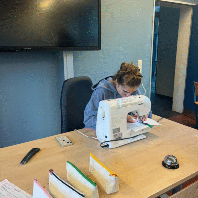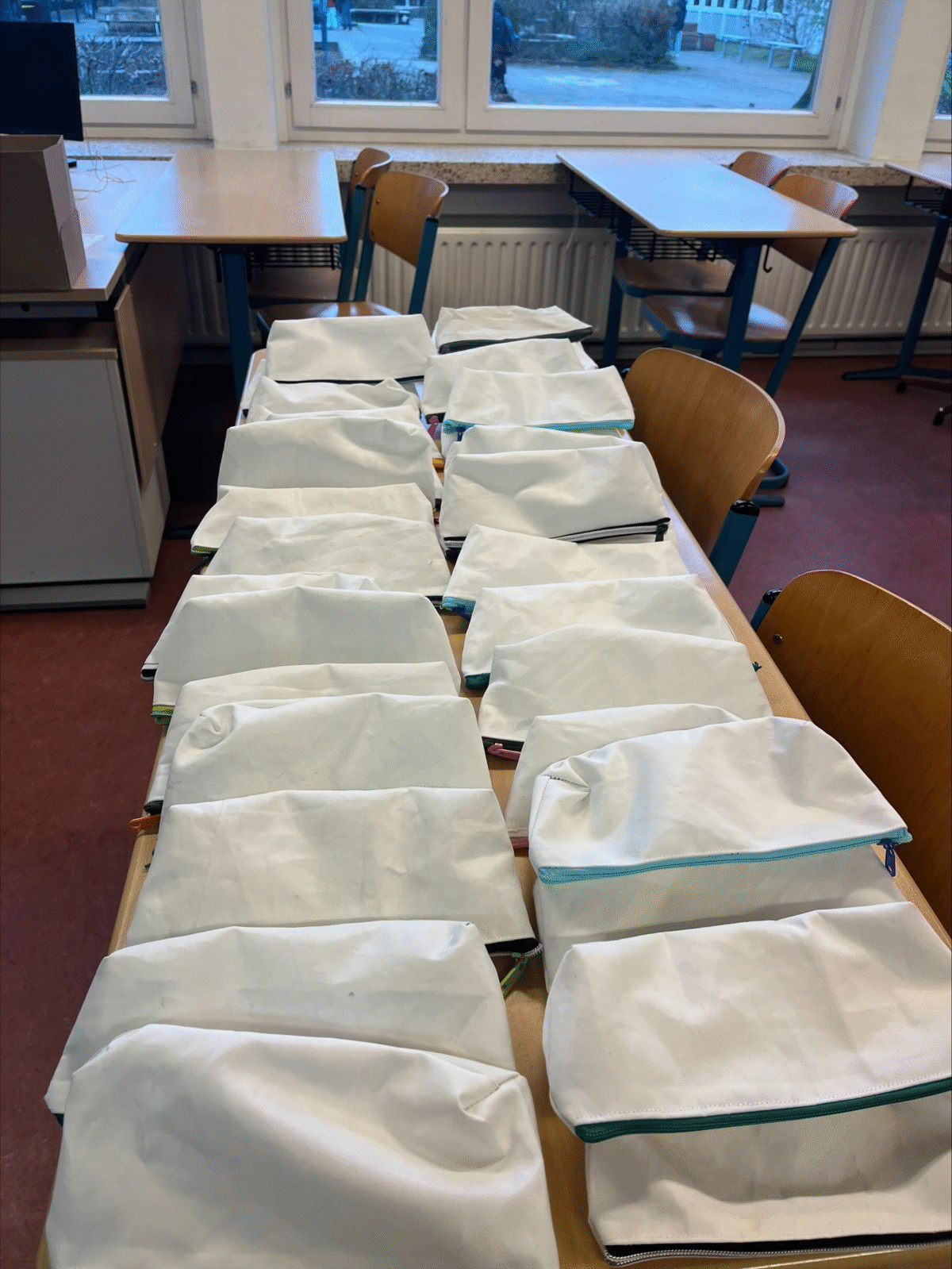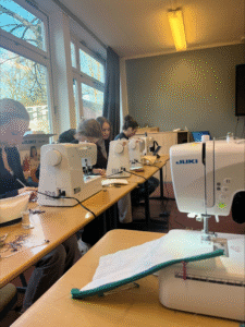 Fast zehn Schüler*innen nähten an einem Tag rund sechs Stunden lang – und fertigten dabei 35 fertige Federtaschen sowie weitere zehn vorbereitete Rohlinge an.