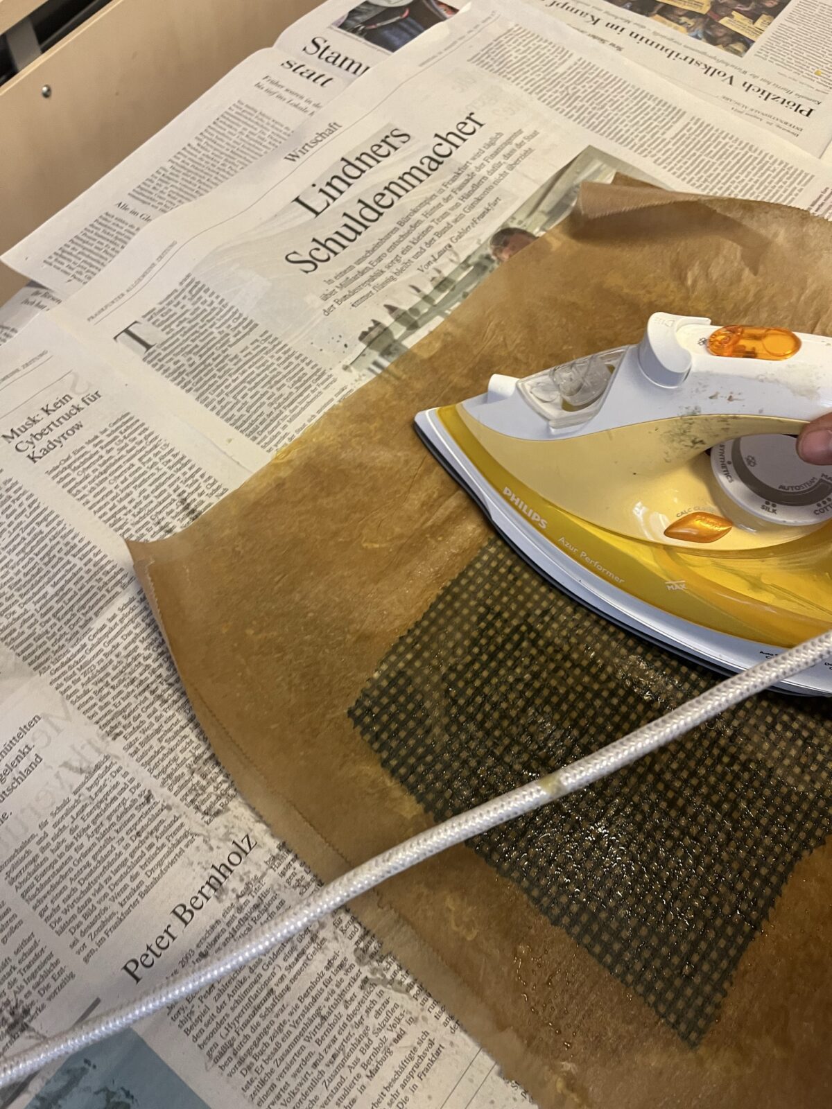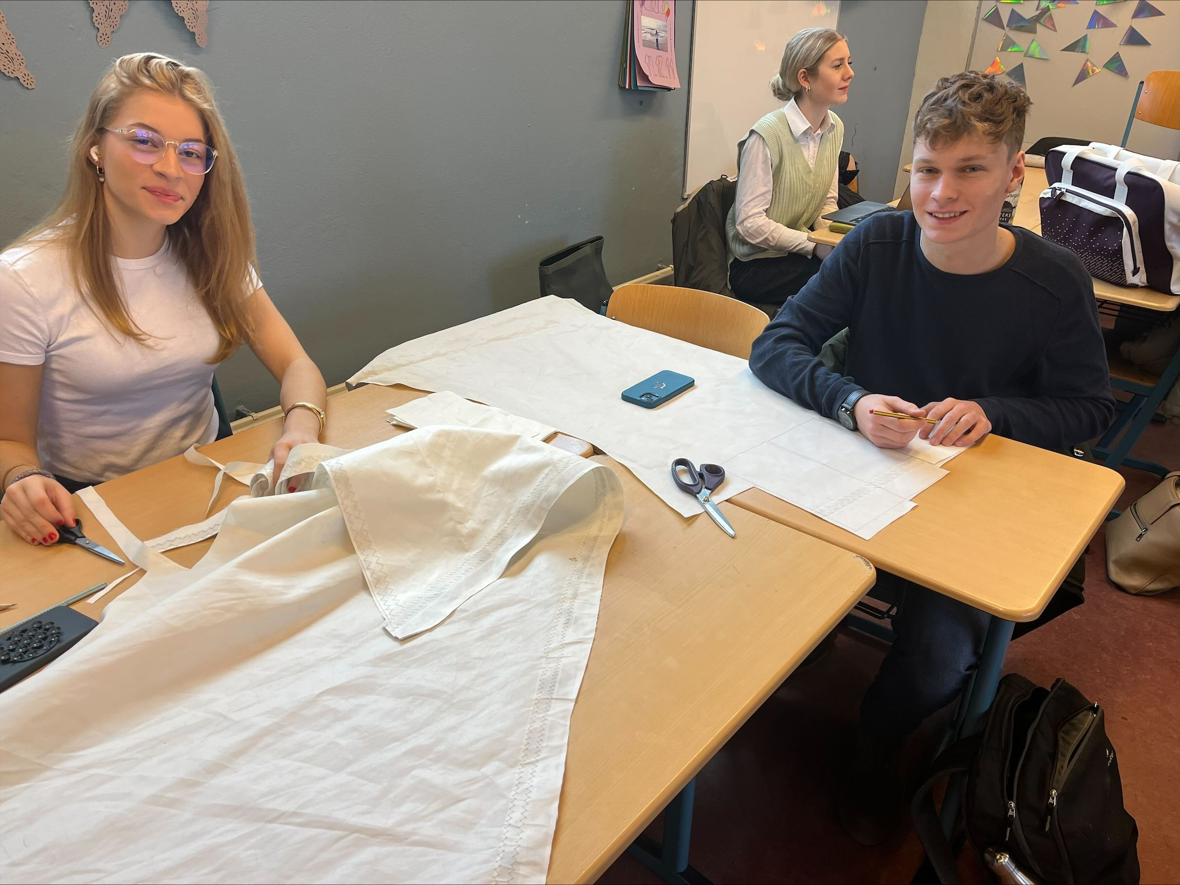 Das Team entschied sich bewusst für gebrauchtes Segeltuch – ein Stoff, der nicht nur langlebig ist, sondern auch eine besondere Geschichte und Ästhetik mitbringt. Dank der Unterstützung mehrerer nähbegeisterter Schüler*innen aus verschiedenen Jahrgängen konnte schnell eine Arbeitsgruppe gebildet werden. Ein Probenähen zu viert bestätigte: Das Material eignet sich hervorragend.