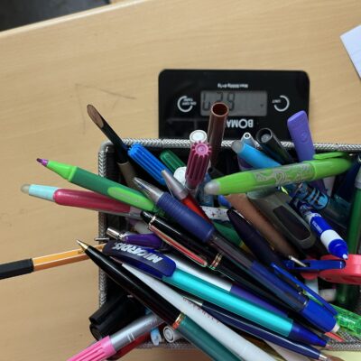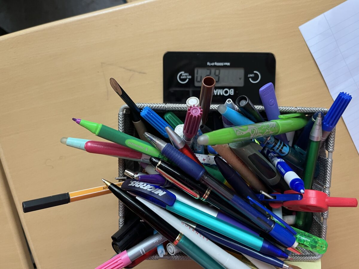 Unter diesem Motto hat die Klasse 9c ein Stiftsammelprojekt an unserer Schule ins Leben gerufen. Vom 07.10.-10.10.24 waren alle Klassen aufgefordert leere oder kaputte Plastikstifte zu sammeln und diese dann am 10.10. abzugeben. Die Menge wurde gewogen und die drei fleißigsten „Sammlerklassen“ erhielten Preise. Insgesamt wurden 17,6 kg Stifte gesammelt. Die Klasse 7c gab mit 2,15 kg am meisten Stifte ab, gefolgt von der 5e mit 1,86 kg und dem S1 Geo-Profil mit 1,47 kg. Bei durchschnittlich 3 g Plastik pro Stift kommt jede Menge an recyclebarem Plastik zusammen.